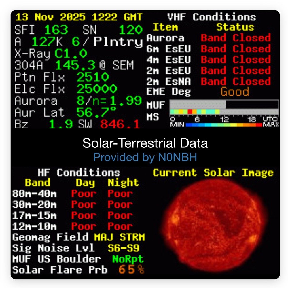 Keep in mind that yesterday (report is below) we had a huge solar storm and this is what the space weather looked like… not today though. The K index was a 1 with good band openings up into 10 meters. I didn’t venture past 15 meters today as I ran out of time but 15 was booming today! I even worked a little CW while I was there. I was a good time.