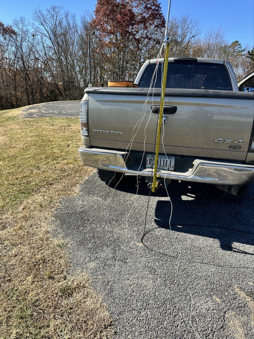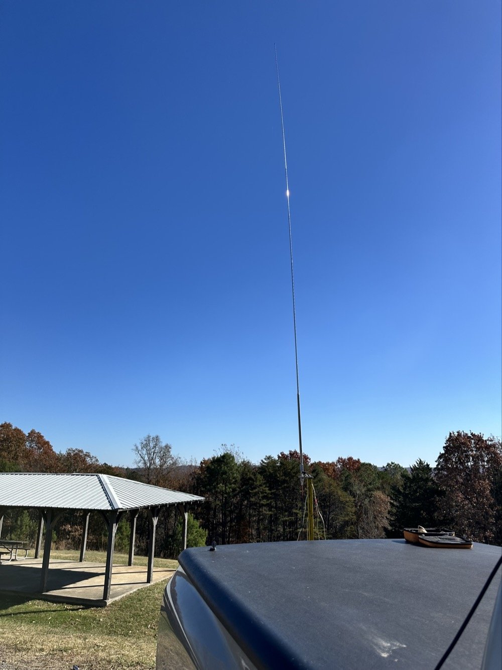 I packed up the HF Signals sBitx and headed to US-2169 and setup at the Frisbee golf parking area on top of the mountain today. I also have a new vertical now as well. The old one that I bought at Orlando Hamcation met a terrible fate recently. I strung it up like you see here, but while I was at the campground, forgot it was still on the truck and proceeded to drive home like this. Needless to say, when it got home, it was bent beyond repair so I threw it in the scrap bin and ordered a new one from Amazon. Turns out that if you don’t pay close attention to the details of the item on the listing, you will get something other than what you actually want.