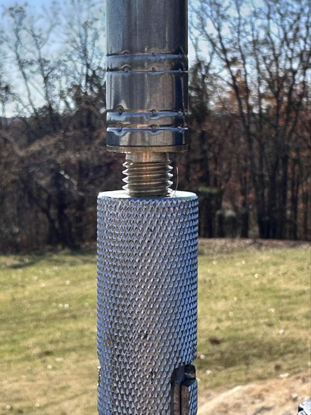 If you will look below at the close up of the antenna base, you will see that I was dancing with destruction today as I had only ONE thread holding the vertical in place. I was fortunate in that there was almost no wind today so I didn’t have any trouble with this little problem. I am going to make a custom QD mount that has the 10mm thread in it so I can use this antenna with a custom QD holder like the hamsticks and the old telescoping whip. I just tightened it as much as I could by hand and stuck it on the base…lol… and it worked. Lesson here is that I should have tested or built out the system prior to arrival at the park. Finding out that your antenna threads don’t work when you are setting up to activate is NOT the time to learn this information!