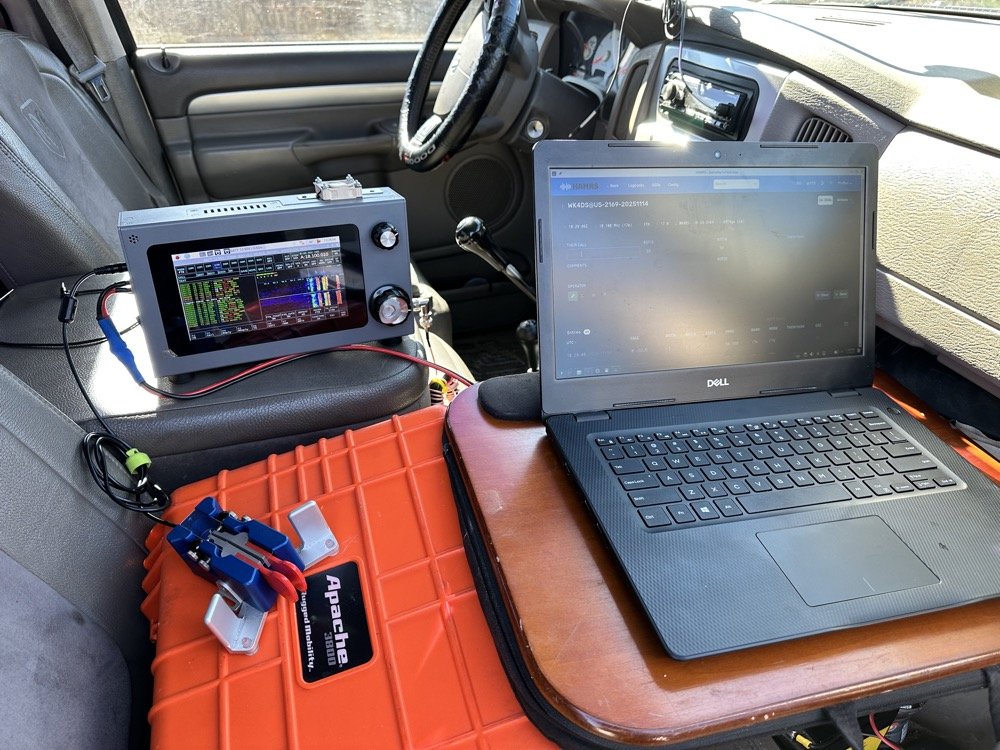 This was a new idea for an operating position in the truck. I usually locate everything to where I can sit in the truck and stay warm and dry in the winter, but today was really nice so I wanted to be out of the truck. I chose to flip it all around and work in like this. It was not as convenient as sitting in the seat and using the armrest as a table but it worked. I did struggle to send good code with the key not being stable on the storage case like it was, never the less I managed. Once again, logging was via the Dell Inspiron with Open Mandriva-Linux and HAMRS. This made for a really clean operating position since the radio holds the keyer memories inside it and I only need the key to plug into the radio. I am not showing CW mode in this photo…actually, I don’t think I got a single photo of the radio while in CW mode…suffice it to say, I love it though.