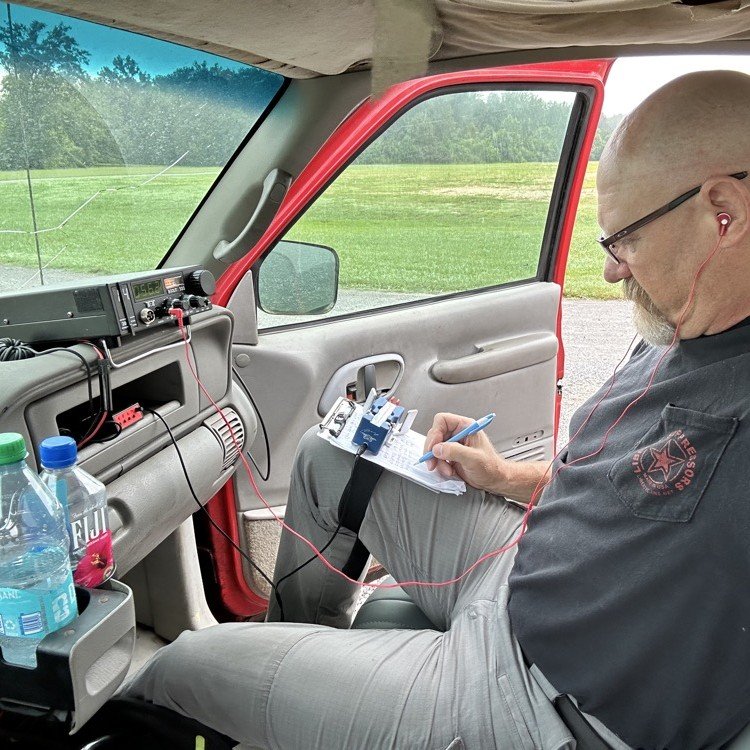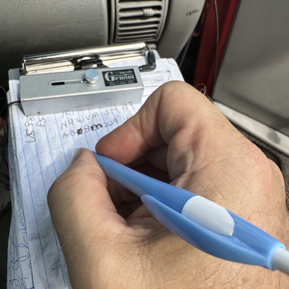 I also FORGOT MY COMPUTER to log with…uggg. This means I had to make an impromptu log book out of some old scrap papers I had in my “possibles tote” that I take everywhere and use the flight leg board for a table. As you can see in this photo, I was still using the Begali Traveler at this point. This key is nice as long as you have somewhere to sit it down, it is not a good hand held key so I put it away and got out my Gemini travel key and used it for the rest of the day. This IS the perfect key for this type of setup in my opinion.