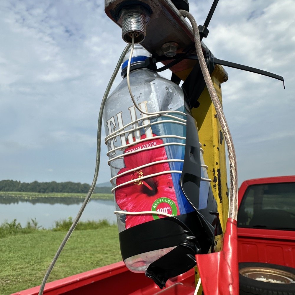 Just looking at the mess below would make you think there is no way this would work at all. The reason it does is that RF energy doesn’t play by the same rules (it really does but I like the euphemism) and can work with all sorts of oddities around it. It just needed to see what appears to be a longer antenna than what was physically there and this little home made coil on a water bottle fit the bill. I am not sure what the two shorter radials were contributing to be honest as I forgot to connect the ground plane to the black connector on the BNC to banana device. They probably acted like capacitors to ground as they would be capacitively coupled to the vertical at the base and would couple to the load coil since they are running right by it. This is speculation on my part because how in the world would you model this menagerie? HAHA!