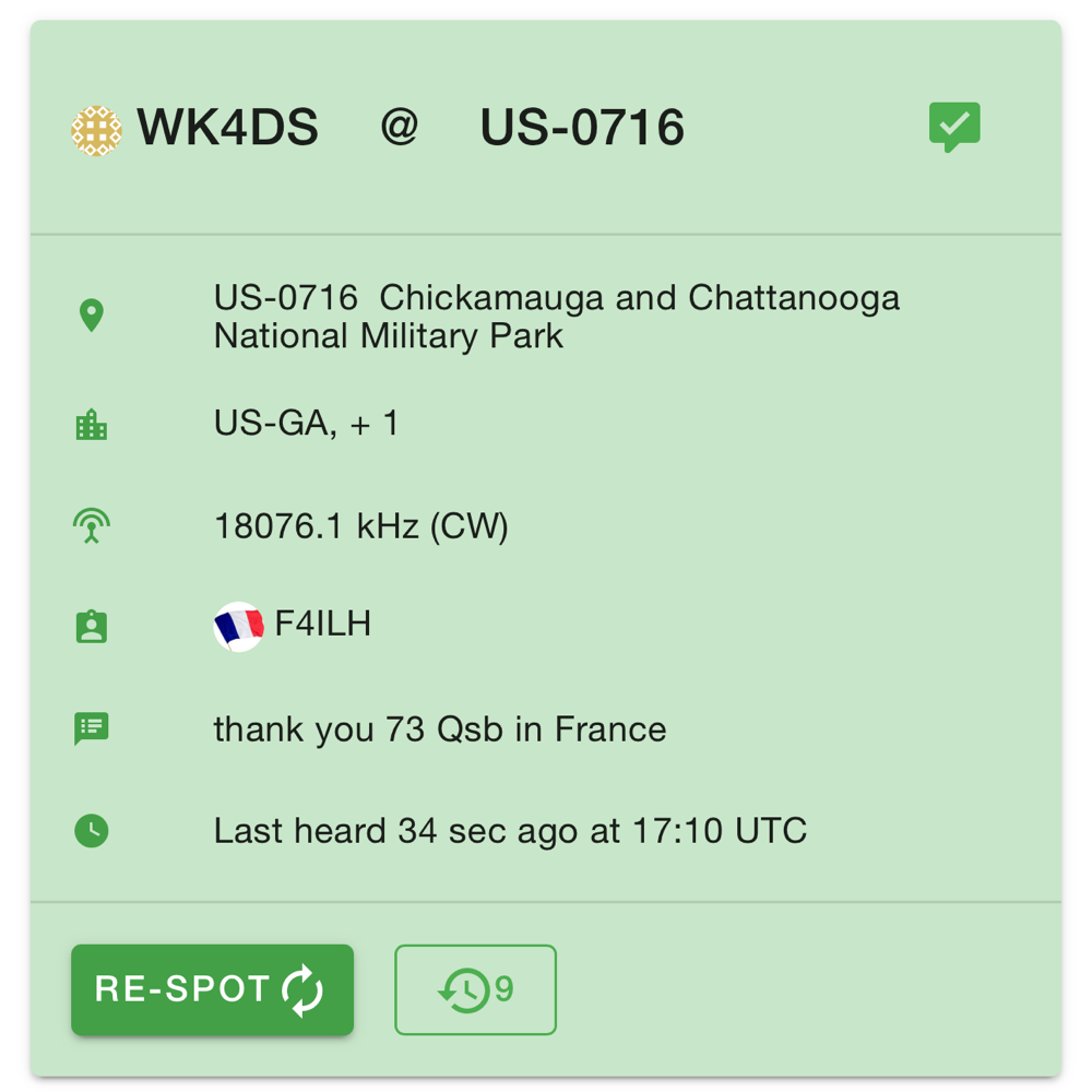 Once I got finished working 20 meters, I moved up to 17 meters to see what I could find there. The antenna REALLY likes the 17 meter band with these two radials too as the SWR fell to almost perfect on this band. I am not sure what it is about this setup that works so well here, but it really does work. Right after I got setup on 17, I started hearing ANOTHER weak signal down in the noise. 17 was fading pretty good at this point, but all of the sudden, BAM! He comes out of the noise and I hear his call sign. F4ILH! I got Japan and now France too! This is a good day for DX at a POTA park. You can see where he sent a message in his spot on the POTA website where he also noted the band was fading (QSB). It is always interesting to hear far away callsigns when I am at a park. Sometimes I miss the first letter as it wont be an A, N, W, or K since those are the lion’s share of the calls I copy when activating. I will have to ask for a repeat to make sure I heard something else. That is what happened here. I had the 4ILH part, but wasn’t sure about the first letter till the band came back in.