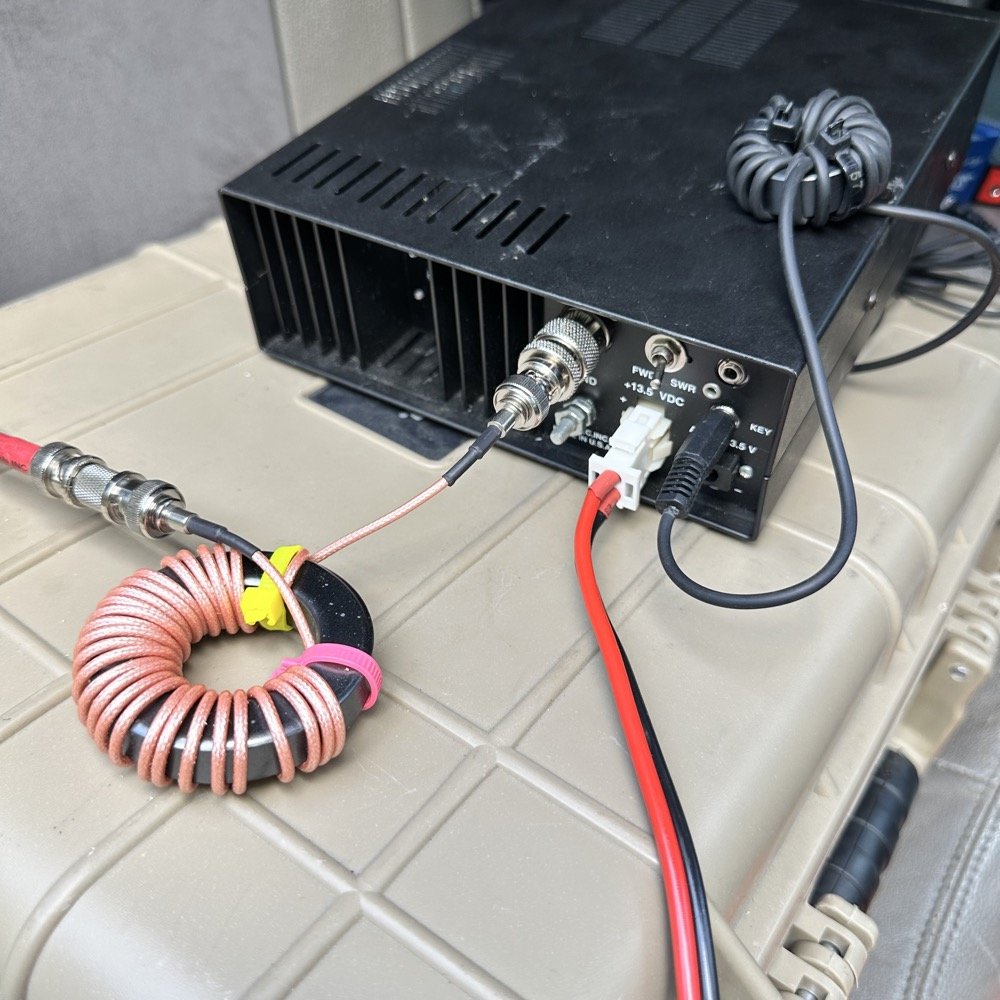 Here is something else that I have started putting into play more frequently. RF chokes on everything. I still have not added them to the power leads, but at some point I think I will. They technically are points on ingress for stray RF so they need them too. The black cable above is the cable to my Pico-keyer and the other is obviously the Common-mode choke for the antenna. I use this on all my POTA rigs. It is made with RG316 and can easily handle the 50 watts that the Scout puts out. It doesn’t even get warm… The reason it is so big is so I can get the full 6 feet of coax wrapped onto the core. I did some testing with it on the nanoVNA and the performance is incredible. This choke has 29 turns of coax and you should see the plots for the HF bands with this thing in play. It stops over 40dB on some bands and I am thinking it gets nearly to 50 on one, if I remember right. I don’t mind the size of the toroid since I am not back-packing this rig, weight is not an issue for me here. If it were, I would probably make a smaller one instead or use the coax by ABR Industries that has the chokes installed on it. (I have one of these and it is awesome).